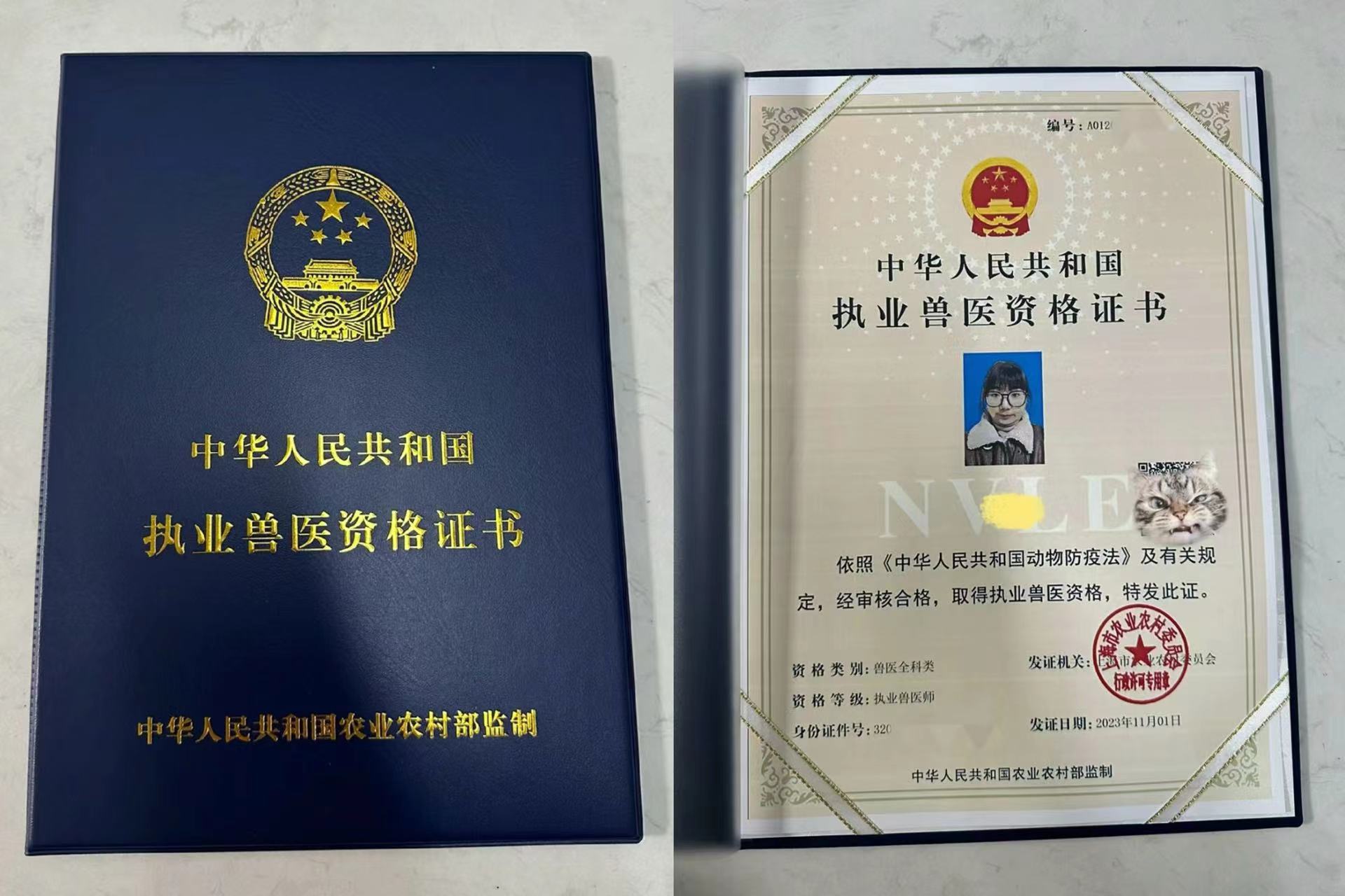 报考专业:执业兽医师资格证分兽医全科资格证书和水生生物资格证书两种,前者颜色为黄色,后者颜色为天蓝色 |